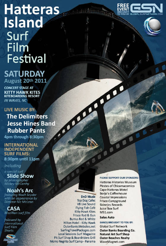 The 2011 Hatteras Island Surf Film Festival will be held this Saturday, August 20 from 4:00 p.m. to 11:00 p.m. at Kitty Hawk Kites in Rodanthe/Waves, NC. The annual Outer Banks surf film festival will feature live music and surf films all night long on a giant inflatable movie screen sponsored by Global Surf Network.