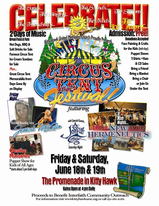 In the 70s and 80s, Circus Tent was a mainstay of Outer Banks life. It appealed to locals and tourists with its evening shows featuring music, puppet shows, ice cream and a subtle Christian message. June 18 and 19 will bring a two-day walk down memory lane as the Circus Tent returns to the Promenade in Kitty Hawk. The New Hermeneutics Band (1971-1973) among others, will return for performances both nights, playing songs for children, folk music and contemporary Christian tunes. Admission is free and everyone is welcome. The gates open at 4 p.m. Full schedule of events is available on the website. For more information call 252-261-2062 or visit http://www.kittyhawkumc.org