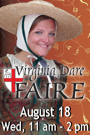 This is also the final week of the 2010 season of The Lost Colony. Known as the nation’s longest-running symphonic dramas, millions have seen the compelling story that celebrates the 120 men, women and children who bravely established the first English settlement in the New World on Roanoke Island in 1587. The colony mysteriously vanished by 1590 and the fate of those first settlers remains a mystery and is one of America's most intriguing unsolved mysteries. The play The Lost Colony is truly unique to the Outer Banks and owes its success to the people of Roanoke Island who have cherished and nurtured the production from its start. So come celebrate Dare Faire and learn the history through music, literature and art!