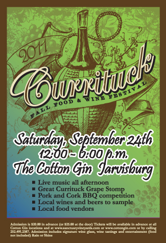 The Currituck Fall Food and Wine Festival will be held Saturday, September 24, from noon to 6 p.m. at Sanctuary Vineyards in Jarvisburg, NC.